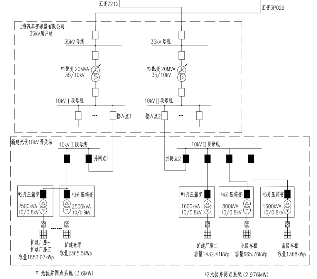 上海汽車變速器有限公司屋頂光伏發(fā)電項(xiàng)目(以下簡稱“本項(xiàng)目”),位于上海市嘉定區(qū),裝機(jī)容量為8.3MW,采用自發(fā)自用余電上網(wǎng)模式。本項(xiàng)目現(xiàn)役35kV用戶站1座,站內(nèi)2臺35kV主變,容量均為20MVA。本次光伏設(shè)計(jì)2個(gè)并網(wǎng)點(diǎn),新建一座10kV開關(guān)站,光伏組件逆變?yōu)?.8kV交流電壓,經(jīng)升壓后2個(gè)并網(wǎng)點(diǎn)以10kV電壓等級分別接入35kV用戶站的10kVⅠ段母線、Ⅱ段母線,并網(wǎng)點(diǎn)容量分別為3.6MW、2.976MW。