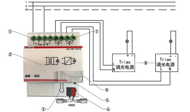 此端子和受控?zé)艟叩腡riac調(diào)光電源接線,可實(shí)現(xiàn)調(diào)光功能