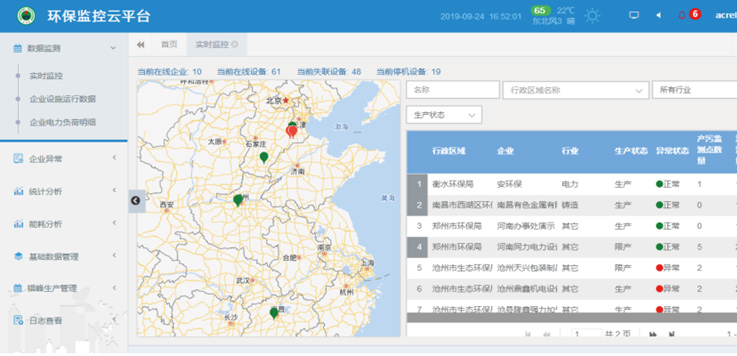 設(shè)備狀態(tài)分析:統(tǒng)計(jì)分企業(yè)某個(gè)時(shí)間段內(nèi)的產(chǎn)污設(shè)備運(yùn)行、停機(jī),監(jiān)測(cè)設(shè)備失聯(lián),可以查看實(shí)時(shí)上報(bào)的數(shù)值。