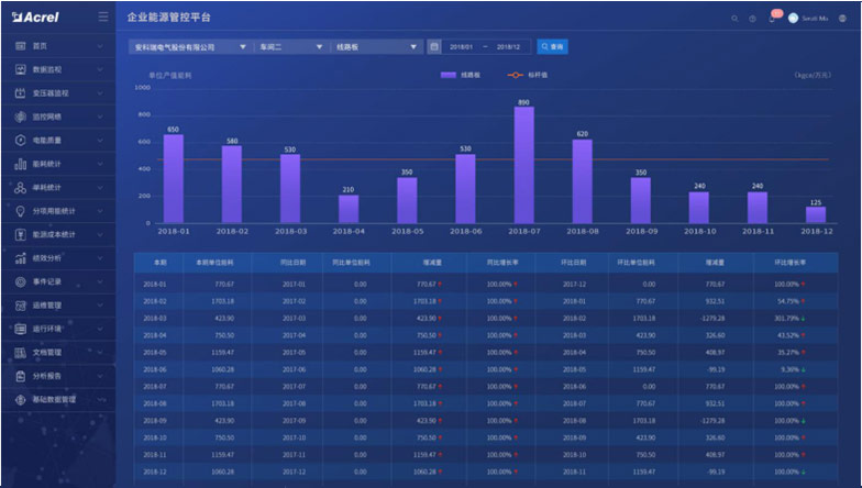 與企業(yè)MES系統(tǒng)對(duì)接,通過(guò)產(chǎn)品產(chǎn)量以及系統(tǒng)采集的能耗數(shù)據(jù),在產(chǎn)品單耗中生成產(chǎn)品單耗趨勢(shì)圖,并進(jìn)行同比和環(huán)比分析。以便企業(yè)能夠根據(jù)產(chǎn)品單耗情況來(lái)調(diào)整生產(chǎn)工藝,從而降低能耗。