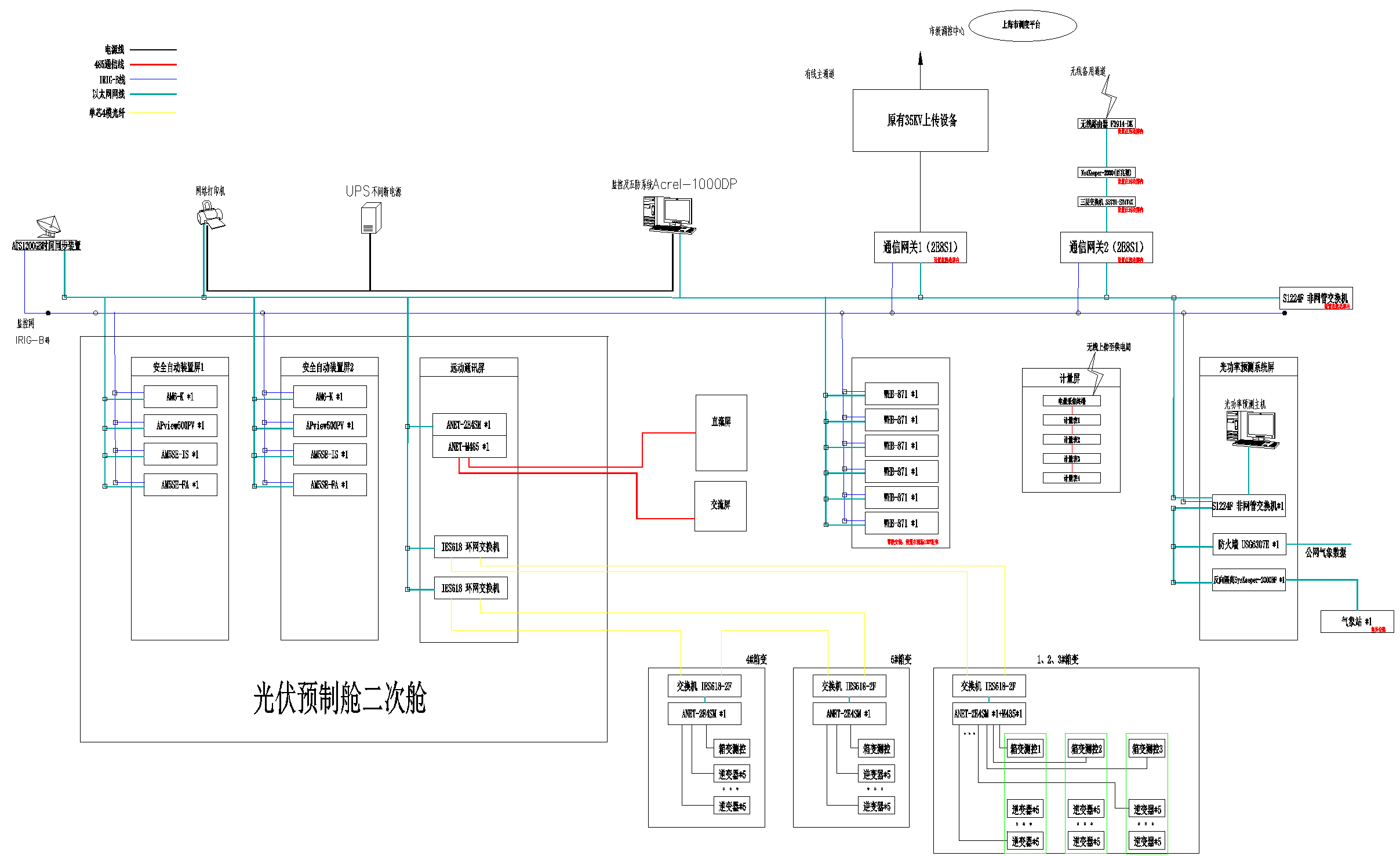 光伏電站中5臺箱變之間通過光纖環(huán)網(wǎng),保證數(shù)據(jù)長距離的穩(wěn)定傳輸,通過通信管理機(jī)及網(wǎng)絡(luò)交換機(jī)實(shí)時(shí)采集微機(jī)保護(hù)裝置、電能質(zhì)量在線監(jiān)測裝置、計(jì)量、遠(yuǎn)動(dòng)系統(tǒng)等二次設(shè)備數(shù)據(jù),實(shí)現(xiàn)光伏發(fā)電系統(tǒng)監(jiān)控與自動(dòng)化管理;同時(shí),配置對時(shí)裝置、遠(yuǎn)動(dòng)裝置滿足系統(tǒng)與上級調(diào)度的需求,配置一套一體化電源系統(tǒng),為二次設(shè)備及監(jiān)控主機(jī)等重要設(shè)備運(yùn)行提供穩(wěn)定可靠的電源,實(shí)現(xiàn)整個(gè)光伏系統(tǒng)的安全、穩(wěn)定運(yùn)行。