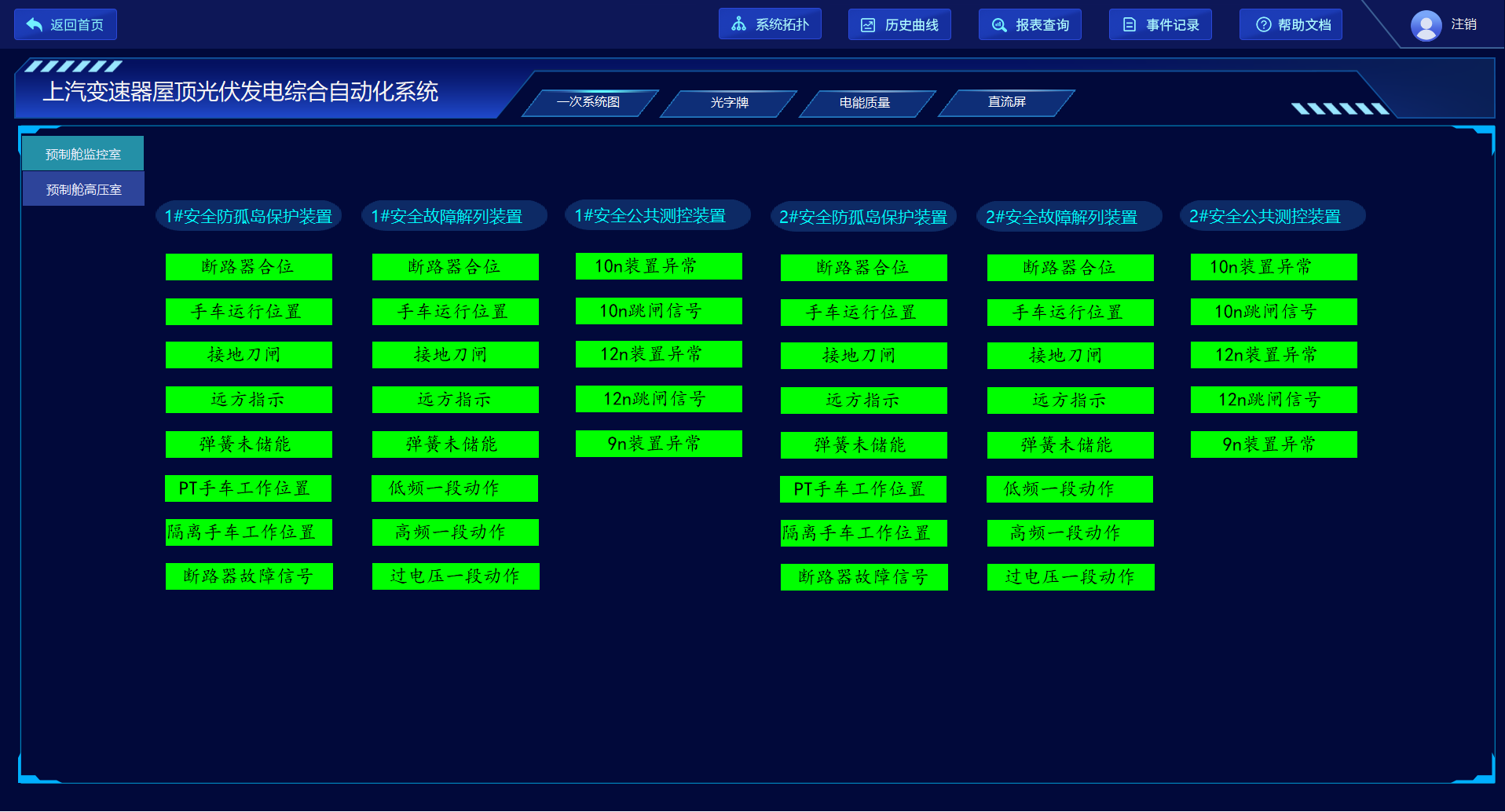 光字牌可以顯示電力系統(tǒng)中設(shè)備的運(yùn)行狀態(tài)和系統(tǒng)的重要信息,為運(yùn)行人員提供清晰的狀態(tài)指示和警示信號,包括二次設(shè)備的異常、跳閘信號,開關(guān)柜斷路器的分合位、手車位置、接地刀閘等信號。