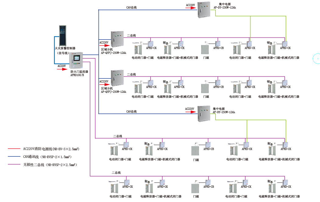 AFRD100B防火門(mén)監(jiān)控主機(jī)集中控制其各終端設(shè)備即電動(dòng)閉門(mén)器、電磁釋放器的工作狀態(tài),實(shí)時(shí)監(jiān)測(cè)疏散通道防火門(mén)的開(kāi)啟、關(guān)閉及故障狀態(tài),顯示終端設(shè)備開(kāi)路、短路等故障信號(hào)。系統(tǒng)采用消防二總線將具有通信功能的監(jiān)控模塊相互連接起來(lái),當(dāng)終端設(shè)備發(fā)生短路、斷路等故障時(shí),防火門(mén)監(jiān)控器能發(fā)出報(bào)警信號(hào),能指示報(bào)警部位并保存報(bào)警信息,保障了電氣安全的可靠性。