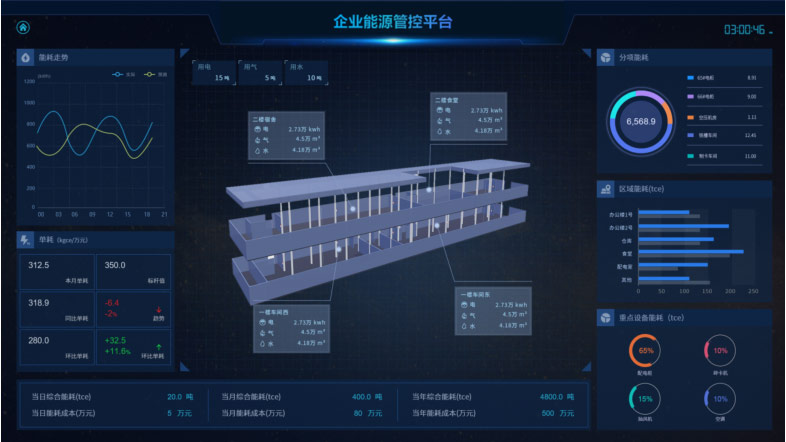 展示企業(yè)各類(lèi)能耗總量、折標(biāo)值、能源成本、能源消耗趨勢(shì)、分項(xiàng)能耗占比、區(qū)域能源消耗對(duì)比,以及當(dāng)前天氣情況、污染情況,并三維展示企業(yè)重要工藝或工段的能源消耗動(dòng)態(tài)。